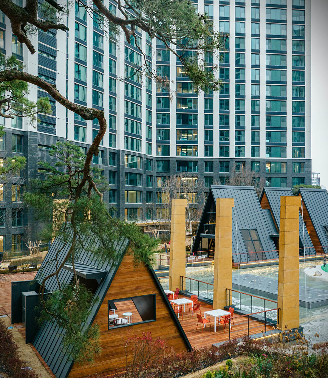 The Natural Tea House was designed in-house by Hyundai E&C. The nature-inspired Natural Tea House is reminiscent of a fairytale cottage. The design of the wooden A-frame cottage was chosen to create a natural atmosphere in the city center. The Natural Tea House is surrounded by a combination of hydroponics facilities and plantings that allow people to relax and enjoy the surrounding views.