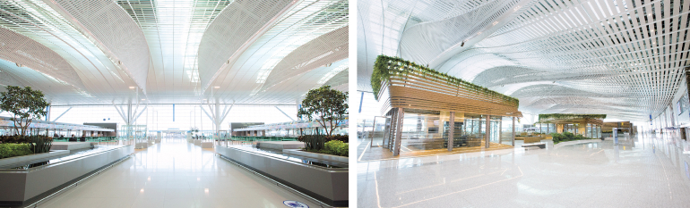 Compared to the ceiling of Terminal 1, which reaches a maximum height of 20 meters, the ceiling of Terminal 2 starts at 10 meters and rises to 50 meters at its highest point. In particular, the ceiling of the ticketing hall is a magnificent work of art. It is made up of thousands of louvers designed to enhance natural light. These comb-shaped louvers, inspired by the feathers of a phoenix, are arranged in large, sweeping curves, creating a striking sense of volume. As you enter Terminal 2 for your flight, be sure to look up at the ceiling!